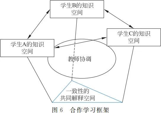 信息的三元传播理论认为个体与个体之间的互动过程才能扩大共同解释范围,使观念或意义得以传达[11]。Vygotsky 的社会建构理论也认为只有在社会各成员之间的交互过程中知识才能得以建构[12]。根据上述理论,教学需要从传统的讲授模式向合作学习模式转变,激发学生主动交互。图 6 展示了合作学习的基本框架。在迷思概念的研究中,人们普遍认为学习是根据先验的知识即前概念来进行构建的[13],这些先验的知识组成了学生头脑中的知识空间。diSessa 认为学生在刚开始学习新概念时所拥有的碎片化知识信息缺乏连贯性和完整性[14],这些造成学生对视觉表现的理解往往局限于表面特征。通过学生之间相互交流与讨论,学生知识空间中的碎片化知识不断地碰撞、融合,加之教师从中调节,最终才能或“同化”或“顺应”成为每个人头脑中的一致性的共同解释空间—系统化的知识体系。小组同学间通过相互依靠、相互促进、发挥责任、和睦相处、定期反思这种交互中的深度学习有助于达成对科学知识的一致性建构,可以最终跨越困境的门槛迈向成功。