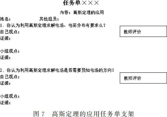 只有向合作学习模式的转向才能进一步为过程性评价提供真正施展的空间。吸取 Li Jing、Isvan 的辅导课开发经验[2-5],我们结合任务分析细粒度流程图,针对学生的迷思概念设计具体的支架,让学生在课堂中可以深入展开讨论。通过对讨论过程以及纸质结果的记录,教师可以最大程度地追踪学生的思维发展动向,在评价教学效果的同时也为教学改进指明了方向。图 7 展示了我们就高斯定理求解电场条件针对性设计的任务单支架。该任务单支架形式借鉴了图尔敏的论证模型,每个问题包含三个部分,学生自己的观点、小组讨论的观点、教师评价[15]。任务单一方面通过合作学习,帮助学生提升分析、综合、评估的能力;另一方面通过过程评价,帮助教师进一步发现学生存在的问题以便后期循环迭代为课程改革指明方向。