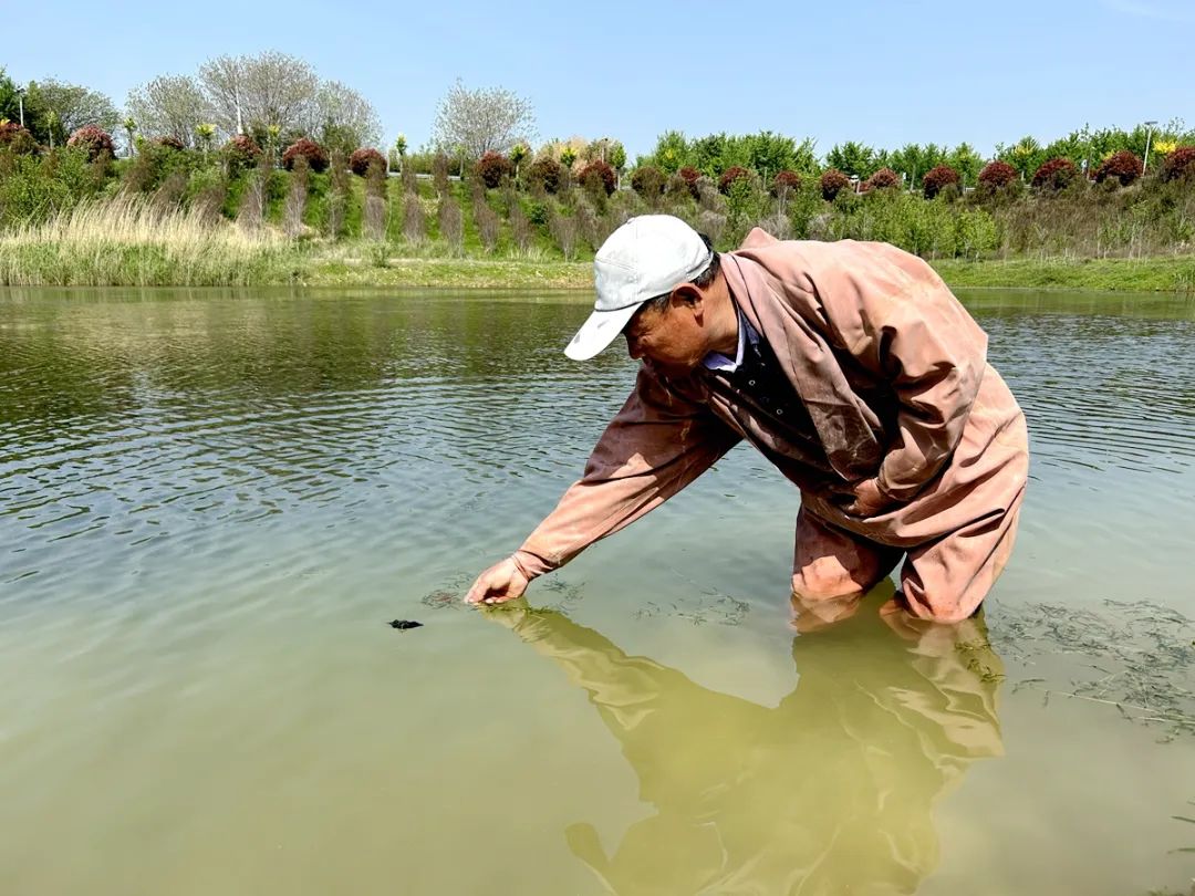 当前正是水生植物快速生长期。在河口村生态园,村书记马赛平正在察看菱角长势情况。