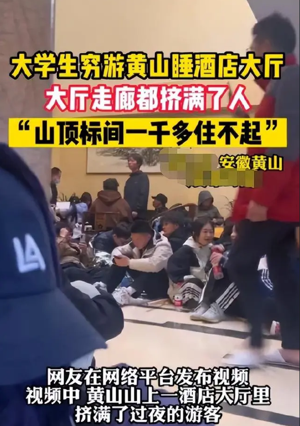 黄山山顶酒店大堂中,滞留的大学生人满为患然而住青旅并不是终点:有些大学生为了直接省去住宿费,在地图上搜索24小时营业的地方,瞄准了深夜12:00后大学生可享69折的海底捞,随时都能充电的麦当劳、肯德基,能玩游戏还能直接躺平睡觉的网吧,夜间超级便宜的KTV,除了洗澡还有自助餐的汗蒸馆……探路先锋的大学生们会像挖到宝藏一样把攻略分享到社交平台:前台有免费热水、有充电的地方、厕所干净,有卫生纸和护手霜……第二天充电宝和自己都满血复活,这就是他们对旅游住宿的要求:“活着”就行。