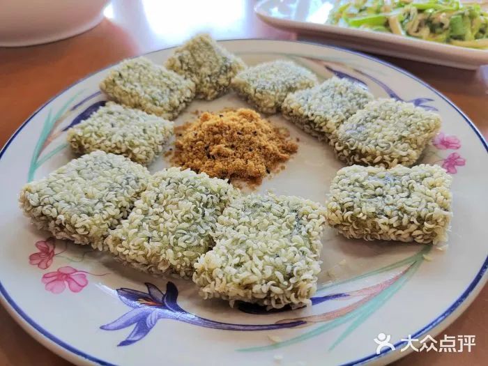 当地土菜艾叶饼怎么能不尝一口,里面裹了芝麻馅,蘸酥糖吃,风味独特。真味臭豆腐