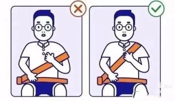 3. 抓住安全带头部的锁舌,沿着身体往下拉安全带。注意安全带不能扭结。如果拉得太快,安全带可能会锁死,此时,只要往回稍微收一点安全带,就可解锁,然后再慢慢地往下拉安全带;