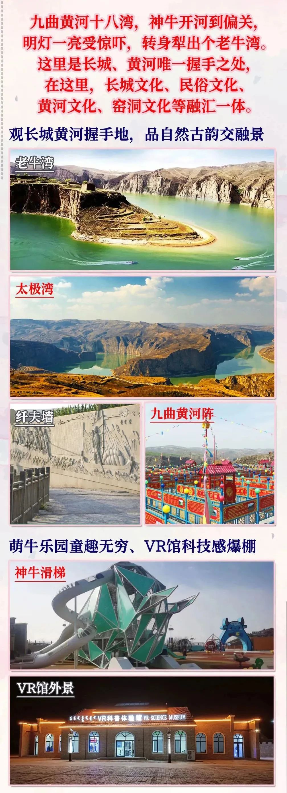 第二日陆路:老牛湾—老牛湾堡—黄河长城唯一握手之处—望河楼—石屏广场(神牛雕塑)—黄河游步道—九曲黄河阵—秀才院—黄河集市(快餐店、农特产品)—黄河文化公园—萌牛乐园、VR馆—四座塔观景台—游客中心—黄河窑(饭店)—返回呼和浩特市。
