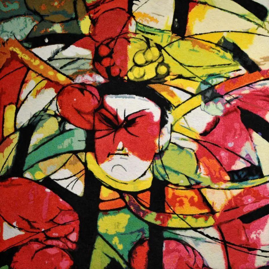 本次展出的纤维系列作品也是潘鲁生绘画经典意象“门神”的延续和创新,艺术家巧妙的将年画门神的图像进行拆分和整合,使观众既获得了新的视觉感受,又能感受到民俗、神话带来的心理安抚。纤维艺术通过针彩的乱针绣来表现艺术家所构思的图像,将织物的工艺与色彩的丰富性、创作的自由性与工艺的限定性结合在一起,形成了新的艺术旨趣。