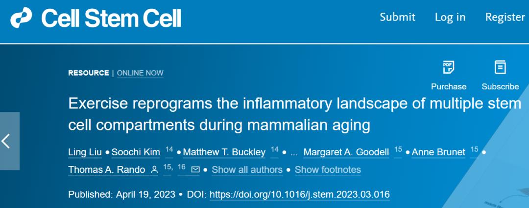近日,斯坦福大学医学院的研究人员在《Cell Stem Cell》期刊发表了题为“Exercise reprograms the inflammatory landscape of multiple stem cell compartments during mammalian aging”的研究论文。该研究生成了一个完整的单细胞图谱来研究运动对衰老过程中干细胞功能和组织稳态的影响,为衰老过程中运动对干细胞的影响提供了一个全面的分子层面框架。