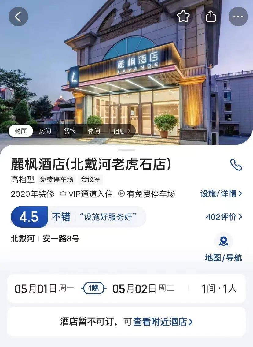 有媒体报道,该酒店为秦皇岛麗枫酒店北戴河石老虎店。4月26日,《IT时报》记者分别通过携程和美团平台查询该店,发现其在两个平台上都已经显示“酒店暂不可订”状态。