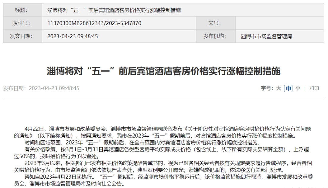 面对让游客望而却步的涨价潮,一些城市也行动起来。4月23日,新晋网红城市淄博的市场监督管理局网站发布消息,今年五一假期前后,淄博在全市范围内对宾馆酒店客房价格实行涨价幅度控制措施。在3月1日~3月31日宾馆酒店各类型客房平均实际成交价格(包含线上、线下所有实际交易结算金额)基础上,上浮超过50%的,按哄抬价格行为予以查处。