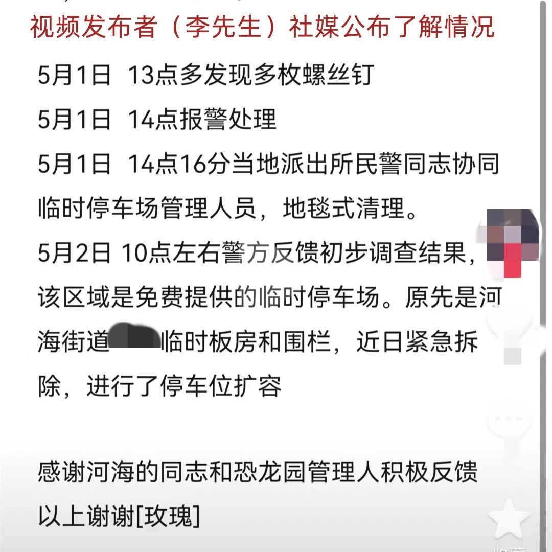 景区:已展开地毯式清理 未发现游客车胎被扎随后,记者再次联系上停车场附近的景区,环球恐龙城旅游区(中华恐龙园所属景区)管委会副主任施先生进行了补充说明,称该停车场为免费停车场,原本是街道的临时板房在此,事实上只在5月1日、2日使用了两天,作为五一假期景区停车场车位不足的补充。发生该事件之后,景区立刻和警方一同对停车场进行检查。