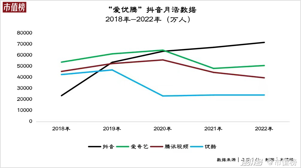 短视频月活数据全面超越长视频是在2020年,这一年抖音的月活超过6亿,长视频平台头部的爱奇艺月活只有5亿多。