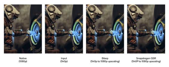 由于 GSR 刚刚发布,托尼也没能搞到演示 Demo,只能先给大伙看看骁龙的卖家秀。根据官方博客里的演示图,这家伙的效果看起来还不错。从 540p 超分辨率到1080p 后,至少没有暴力拉伸图像那种特有的糊。