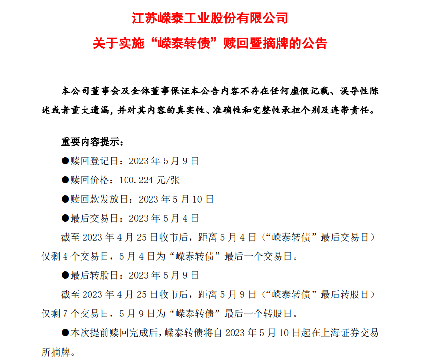 公告表示,本次提前赎回完成后,嵘泰转债将自2023年5月10日起在上海证券交易所摘牌。