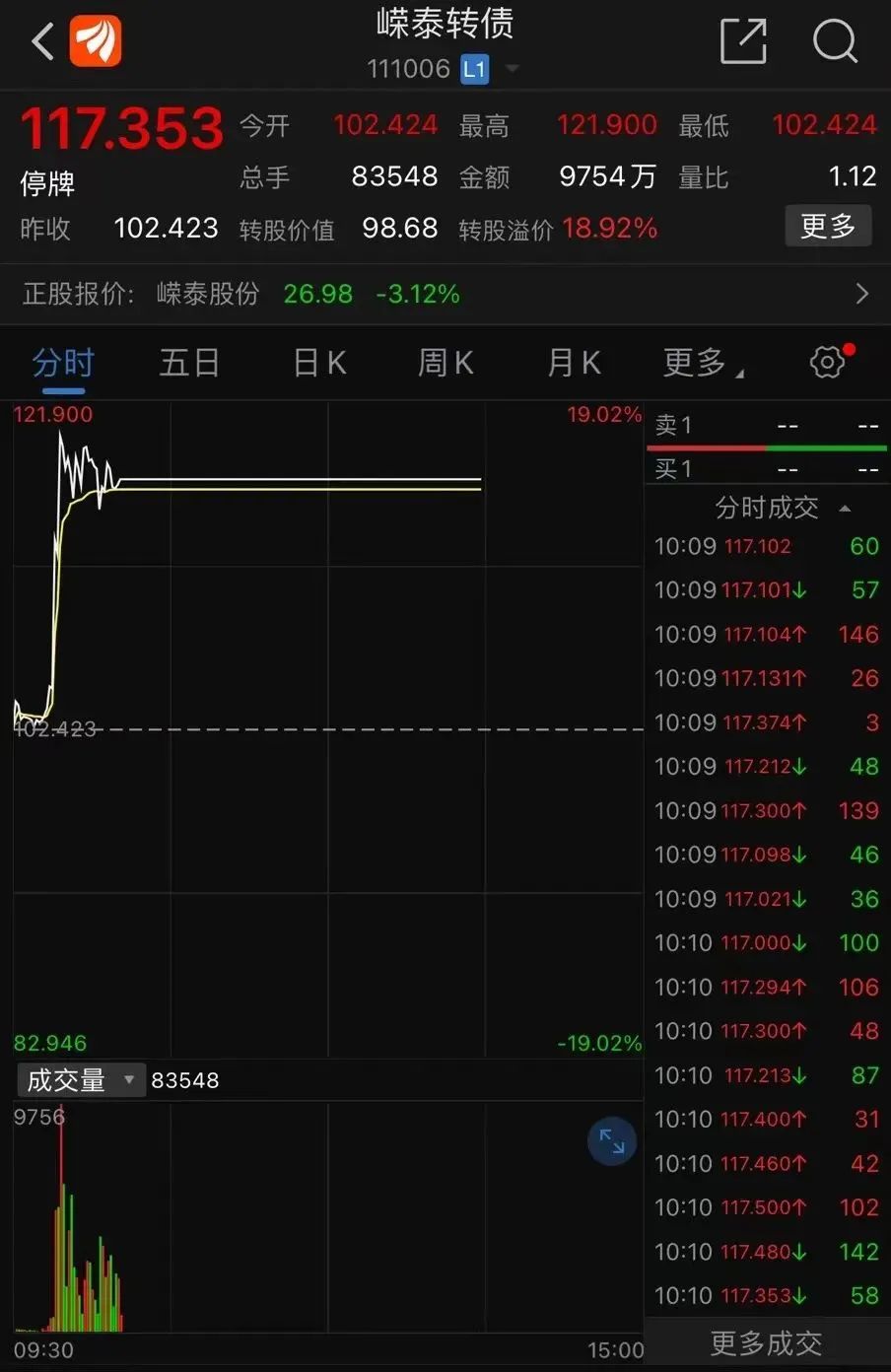 5月5日开盘后,不少投资者发现嵘泰转债依旧可以进行交易,并且具有一定涨幅。嵘泰转债离奇“复活”的40分钟交易中,共成交9754万元。最新价格为117.353元,涨幅14.58%。