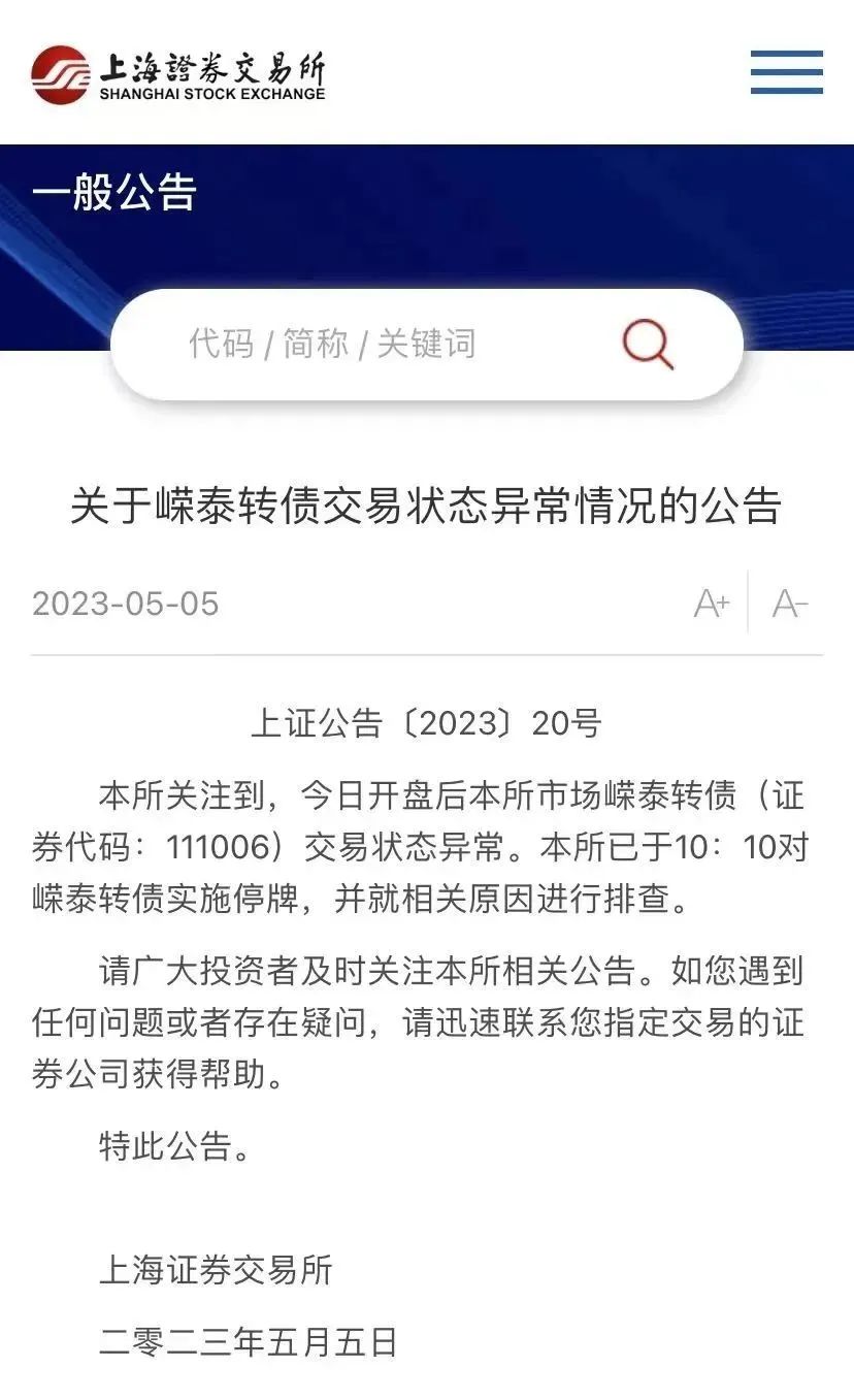 随后,上交所也发布关于嵘泰转债交易状态异常情况的公告,公告表示,本所关注到,今日开盘后本所市场嵘泰转债(证券代码:111006)交易状态异常。本所已于10:10对嵘泰债券实施停牌,并就相关原因进行排查。