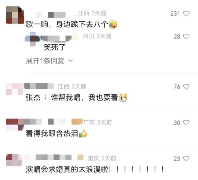 观众们也对演唱会上求婚的行为持不同看法。有观众认为,演唱会上求婚很浪漫,很荣幸能够在现场见证这份浪漫;也有部分观众认为,演唱会上默默求婚还好,如果因为动静太大打扰了其他人,打乱了演唱会流程,会影响其他观众的观演体验。