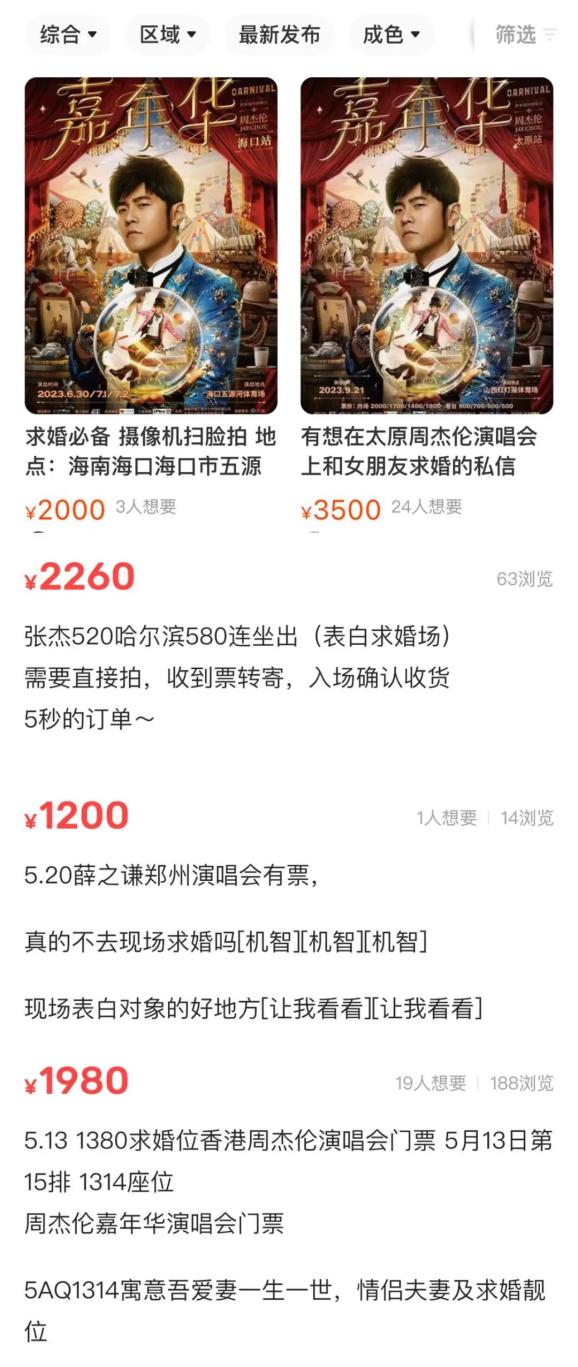 似乎是瞄准了部分观众在演唱会上求婚的需求,有“黄牛”开始卖起“求婚座位”。