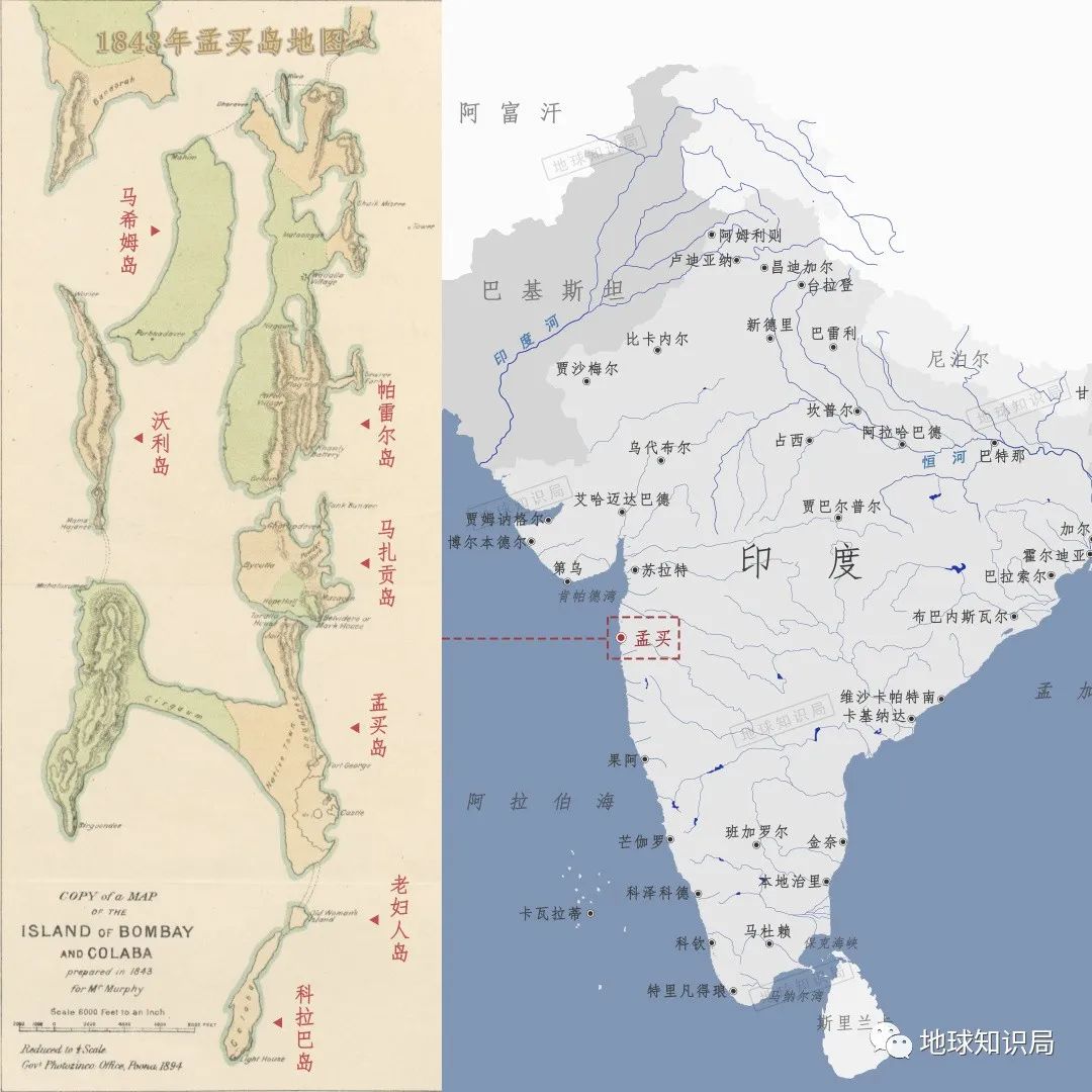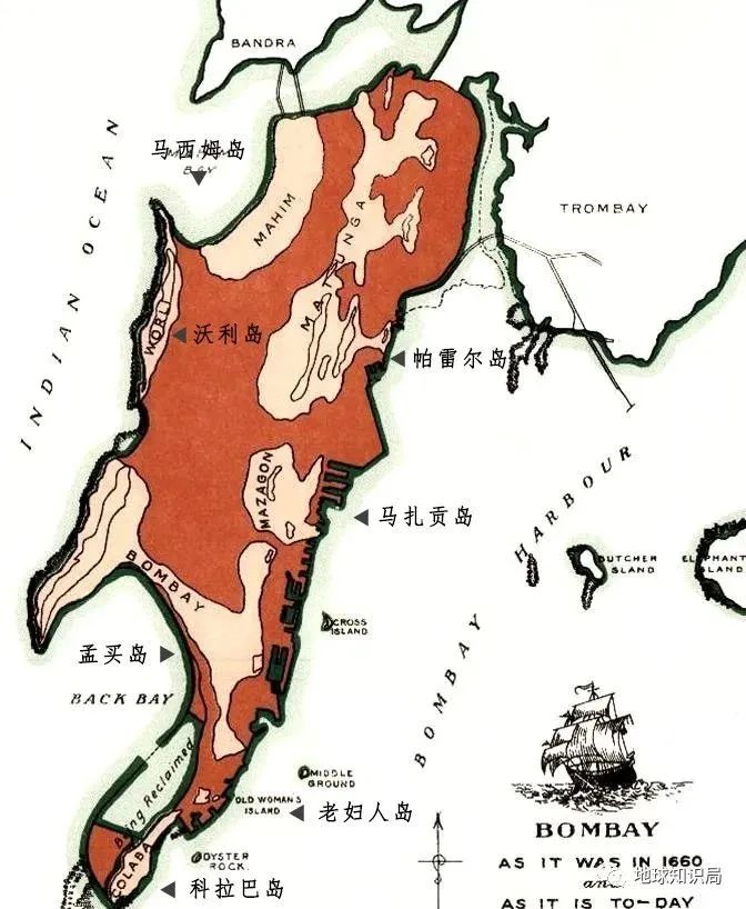 17世纪的孟买七岛与填海后(红色区域)的孟买对比 ▼