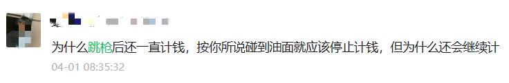 至于有网友说的:“为什么跳枪后还一直计钱,按你所说碰到油面就应该停止计钱,但为什么还会继续计。”其实,大家大可以及时提醒加油员,跳枪后停止加油计费即可。