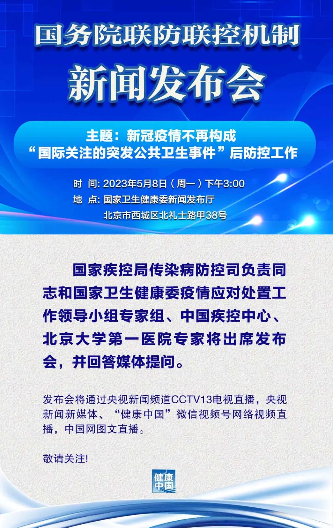 国务院联防联控机制将于5月8日下午3:00举行新闻发布会,介绍新冠疫情不再构成“国际关注的突发公共卫生事件”后防控工作有关情况。
