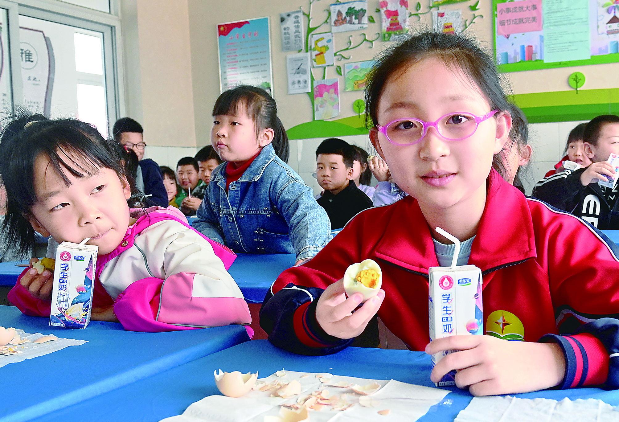 近日,抚宁区榆关小学课间操结束后学生们回到教室,看到一颗鸡蛋和一盒牛奶已经摆放到课桌上。全区目前实现了81所农村小学(含教学点)课间加餐模式全覆盖,年均受益学生1万余名。