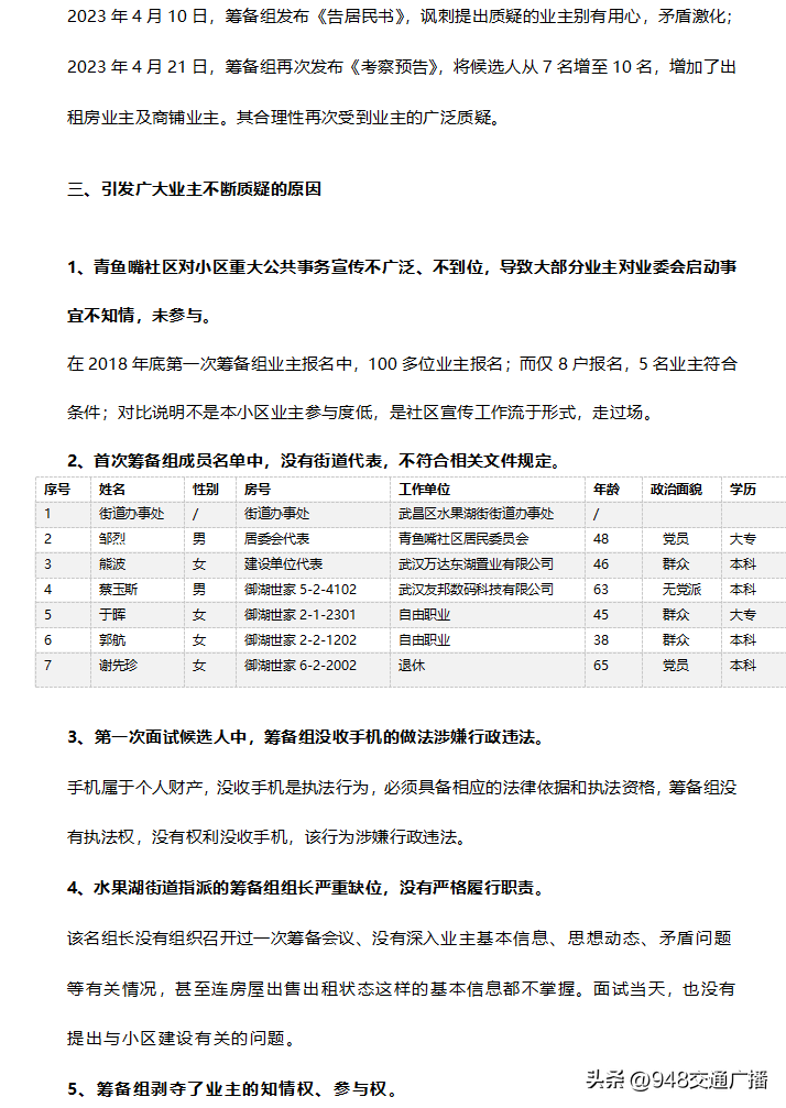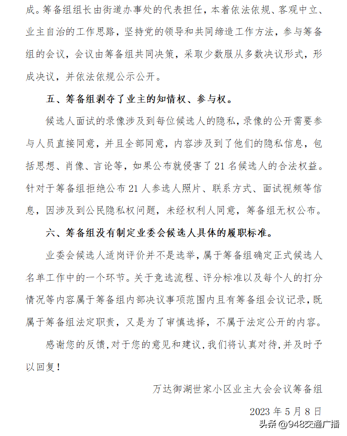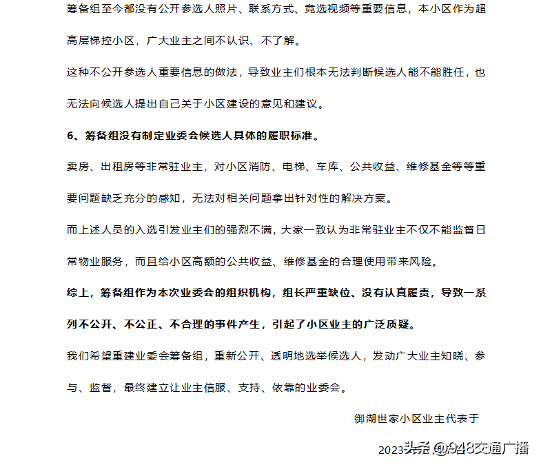 邹烈:我们挑选出来的初步候选人的业主代表,个别代表起初就是他们业主联名推荐的业主名单里面的人,结果公布初步候选人名单之后,这些代表也被认为是暗箱操作的人选,这令我们很困惑。整个流程是依法依规、公开透明、严格按照法律规定推进的,每个环节都有保障,如果没有实质的证据,要停止业委会的组建工作,我们认为是不合理的。筹备组做的是初期的工作,最终十名候选人哪些能成为业主委员会的成员 ,这个权力将交给1100户业主的海选。