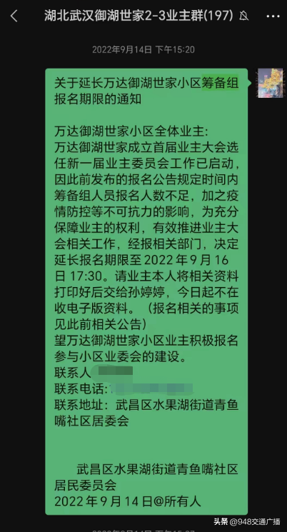 据了解,万达御湖世家小区建成于2015年。2018年底,进行了第一次业主委员会筹备,共有100多名业主报名,最终因业主对社区选定的人选提出质疑,被搁置。为维护自身合法权益、保障小区生活有序进行,2022年8月,万达御湖世家小区进行了第二次业委会筹备。
