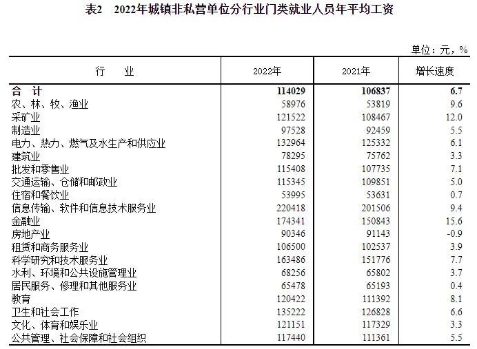 2022年城镇非私营单位分行业门类就业人员年平均工资 图源:国家统计局网站