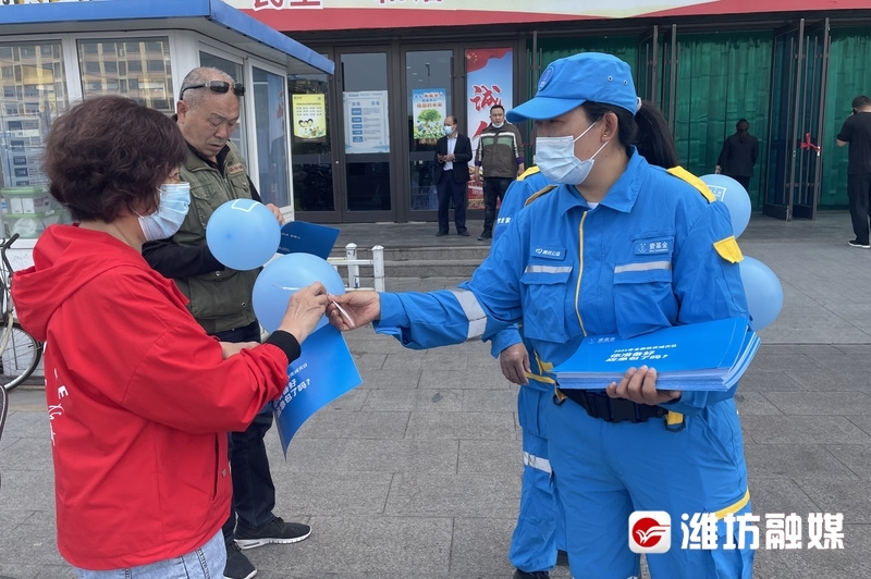 奎文区潍州路街道应急救援队的队员们走上街头,向市民分发“防灾减灾”宣传知识手册。
