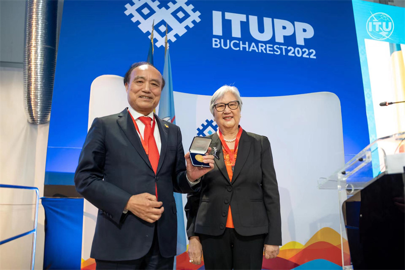 △2022年10月14日,在国际电联全权代表大会上,赵厚麟把大会颁发的金质奖章送给夫人姜爱华
