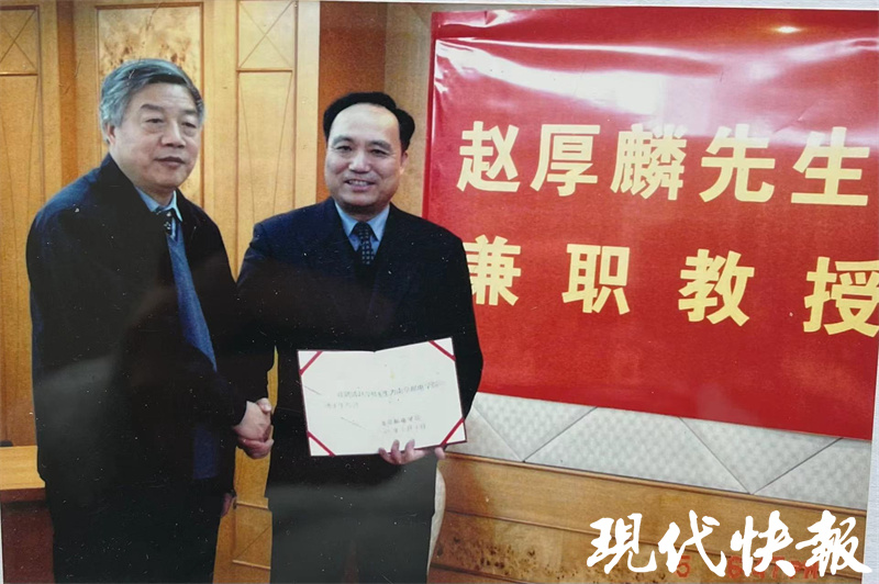 △2005年,时任南京邮电学院院长谢玲为赵厚麟颁发兼职教授证书