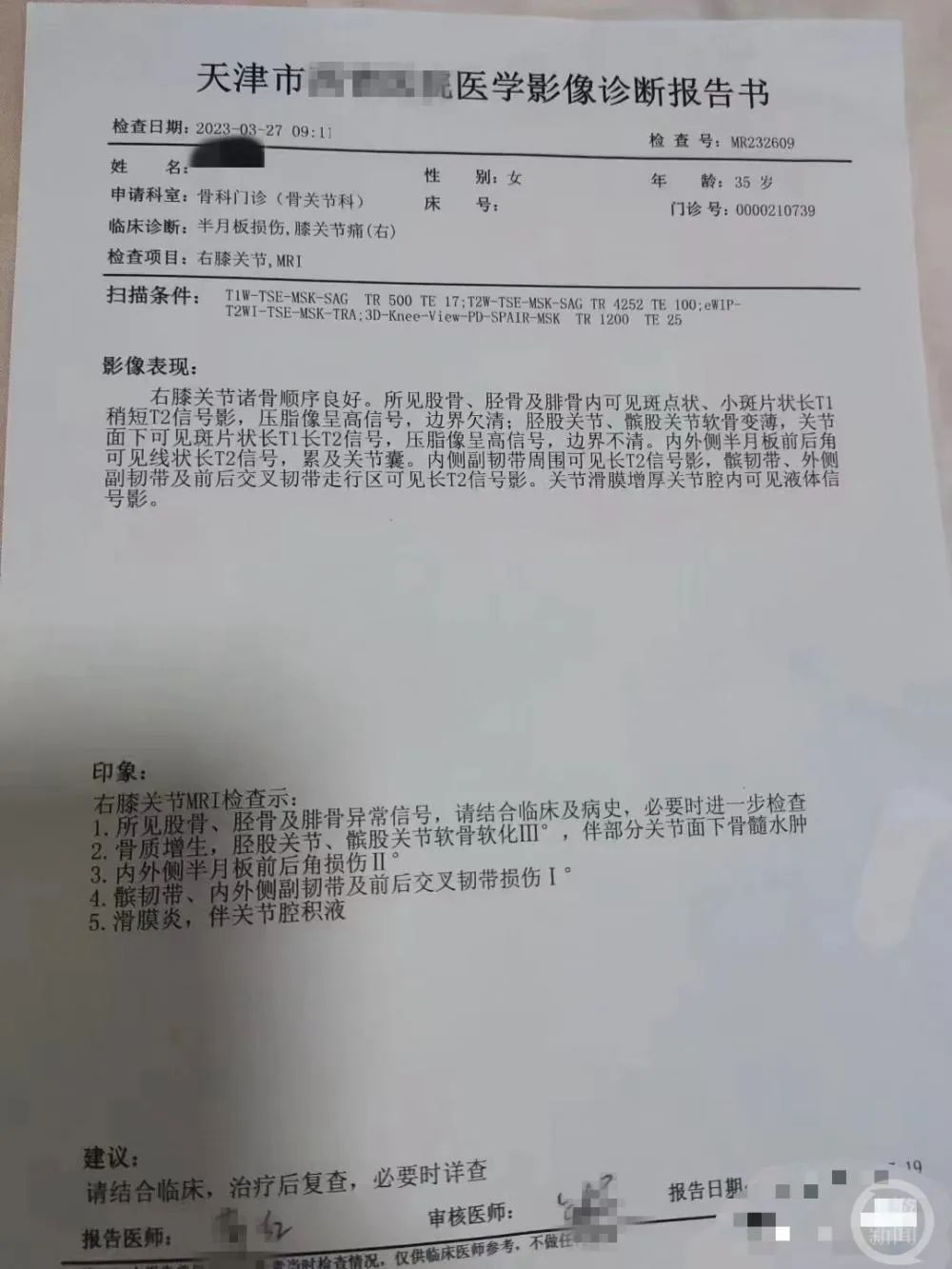 5月11日,上游新闻(报料邮箱baoliaosy@163.com)记者联系了当事人,可她并未回复私信。从她发出的医学影像诊断报告书显示,她今年35岁,在与网友的互动中曾表示自己身高1.60米,跑步前体重为163斤。她跑步锻炼后成功减重43斤后,发现右腿莫名沉重,走起路来膝盖会弹响,右腿感觉到一股从未有过的疼痛感。疼了两个月后无好转,只能去天津市某医院看病,结果被诊断为半月板损伤和膝关节损伤。