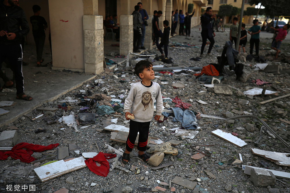 当地时间2023年5月11日,巴勒斯坦汗尤尼斯,以色列空袭后,一个孩子站在废墟中。人民视觉 图