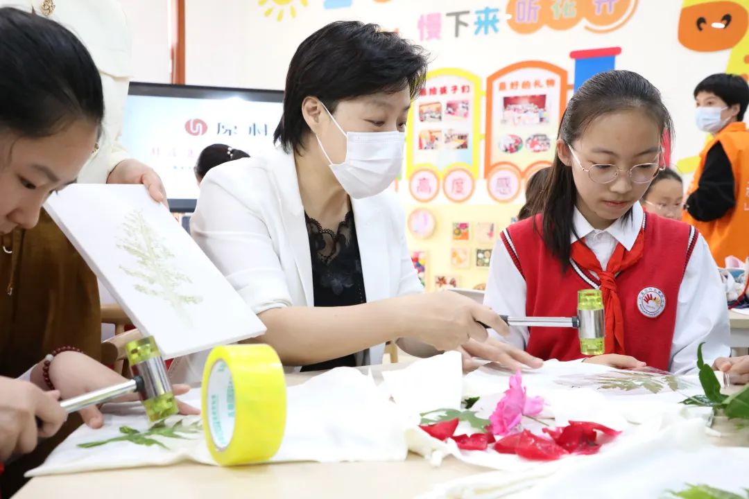 赞皇县原村土布专业合作社为同学们准备了一些土布的边角料,让大家发挥自己的想象力变废为宝,另外,还可以现场体验拓印,通过植物的颜色印在土布上,制作出喜爱的艺术品。随后,在老师的带领下,同学们拿起绿色、环保、健康的土布碎片等工具开始探寻非遗之㺯,体验文化魅力。“我用土布、毛根和纽扣做了一幅飞屋环游记的场景。”北新街小学王熙媛向大家介绍着她的作品:“今天参加这个活动是一次非物质文化遗产的传承,我们可以用五彩斑斓的布匹装点生活,让世界变得更美好。”