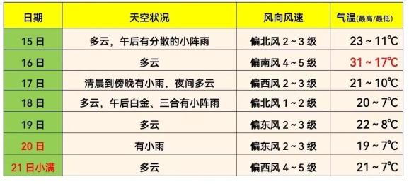 预计本周我市平均气温为16.0℃,较常年高1.0℃,周内气温前期偏高,后期略低;主要降水考虑在17日、20日有两次小雨天气过程,预计总降水量15毫米左右,接近常年(16.3毫米)。