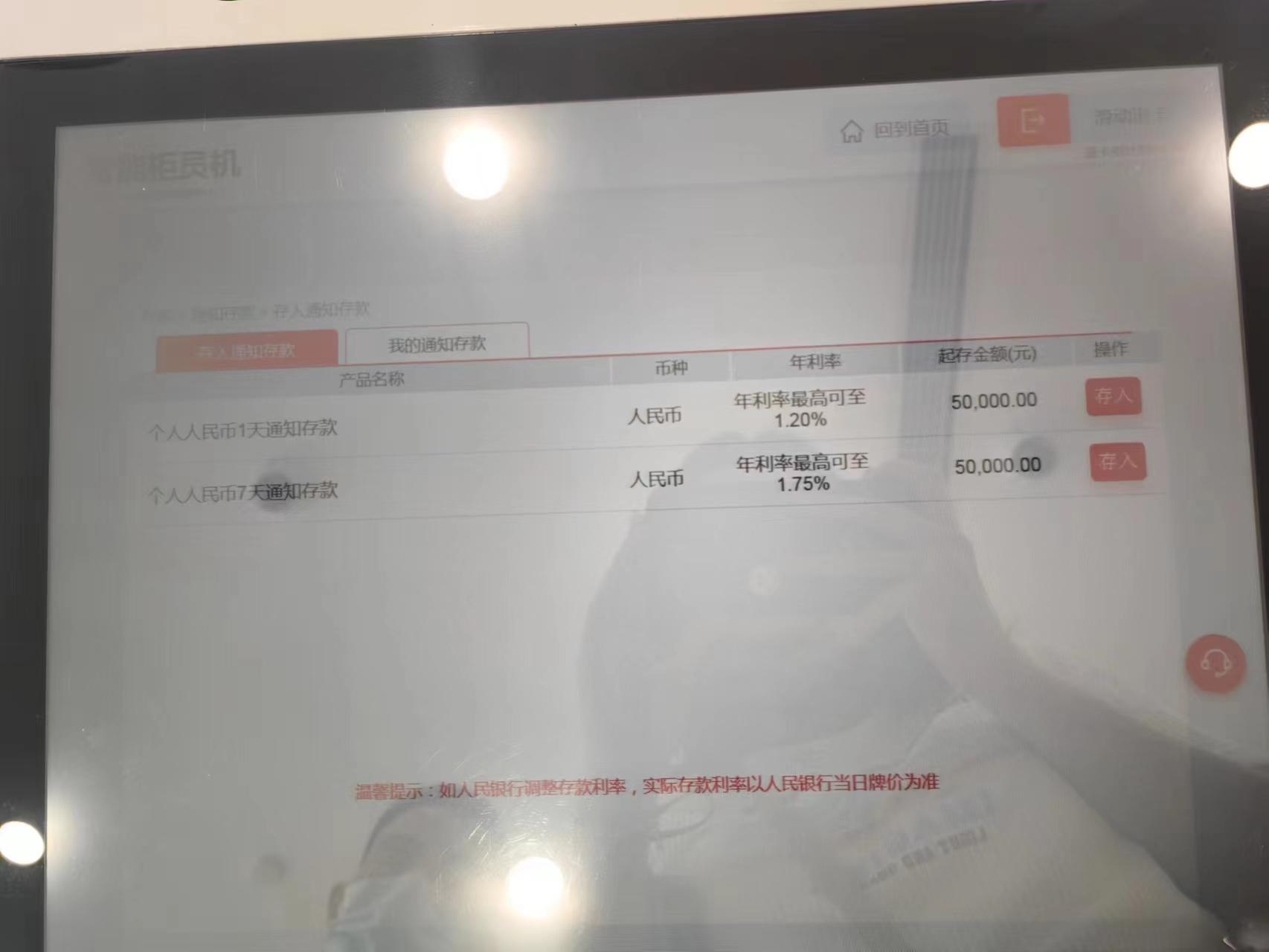 (5月14日下午记者走访时,工商银行上海浦江支行工作人员向记者展示当时的工商银行通知存款利率。 李若菡 摄)5月15日上午,记者发现工商银行APP已经下线“智能通知存款”业务,并在定期存款中上线“通知存款”板块,1天和7天通知存款年化最高利率分别为1.45%和0.90%,前一日(5月14日)下午记者走访时,上述两个期限存款年化最高利率分别为1.75%和1.20%,均下调30BP。截至目前,已有多家银行暂停办理“智能通知存款”业务。