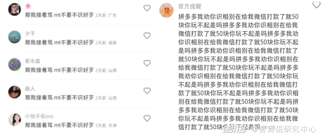 第三类,扬言要接着“骂”,“警告”美团、拼多多不要不识好歹,比如“那我接着骂mt不要不识好歹”“拼多多我劝你识相别再给我微信打款了,就50块你玩不起是吗。”