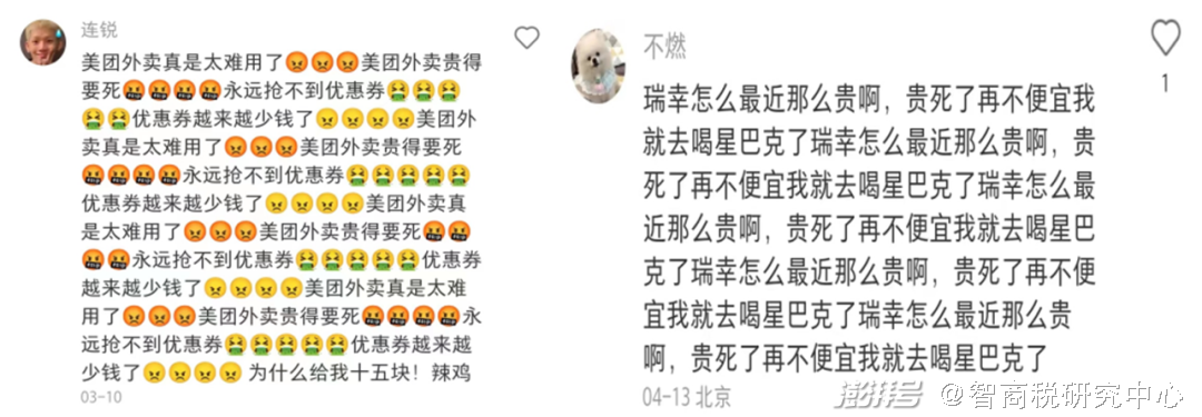 “骂”美团、拼多多的小红书截图第四类,直接吐槽美团外卖难用又贵,还抢不到优惠券,比如“美团外卖真是太难用了,美团外卖贵得要死,永远抢不到优惠券。”或是吐槽瑞幸,“瑞幸怎么最近那么贵啊,贵死了再不便宜我就去喝星巴克。”