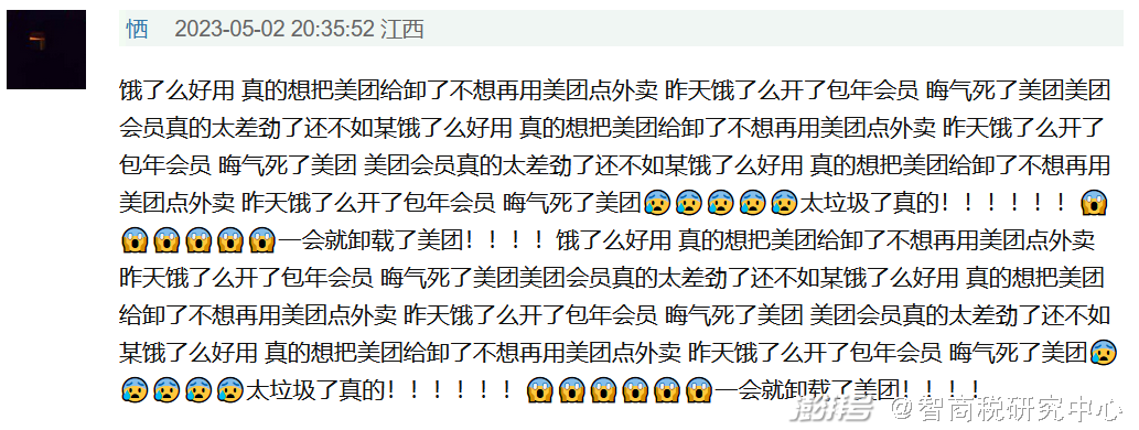 比如,“饿了么好用,真的想把美团给卸了,不想再用美团点外卖,昨天饿了么开了包年会员,晦气死了,美团会员真的太差劲了,还不如某饿了么好用。”“移动卡对我太不友好了,打算停用移动卡。”