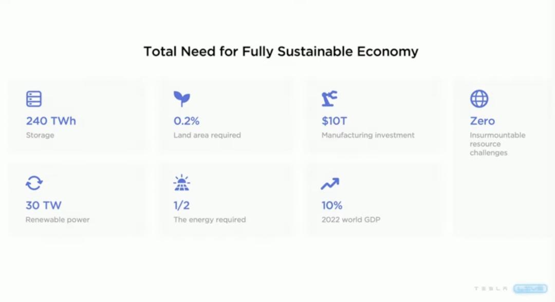 今年 3 月初,特斯拉在投资者大会上首次展示了看起来颇为宏大且遥远的 Master Plan Part 3(主题是加速世界向可持续能源转变,计划中的目标包括 240 TWh 储能电量 + 30TW 可再生能源功率 + 10 万亿美元建设投入 + 全球陆地面积的 0.2% 用于可再生能源基建)。