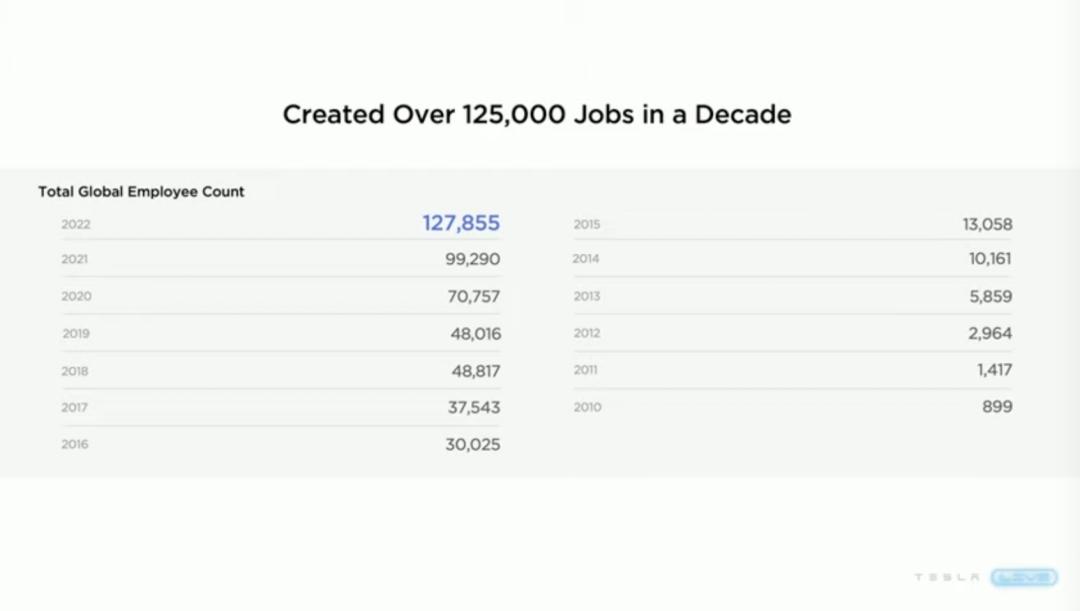 接着,马斯克又进入到了一连串的「秀肌肉」环节,主要是展示了特斯拉在公司、产品等方面的成绩。比如说,他强调,特斯拉工厂位居业界最安全的工厂之列,而特斯拉也是最受欢迎的工作地点;同时,特斯拉在十年里创造了超过 125,000 个工作岗位——2022 年,特斯拉的员工总数量达到了 127,855 人。