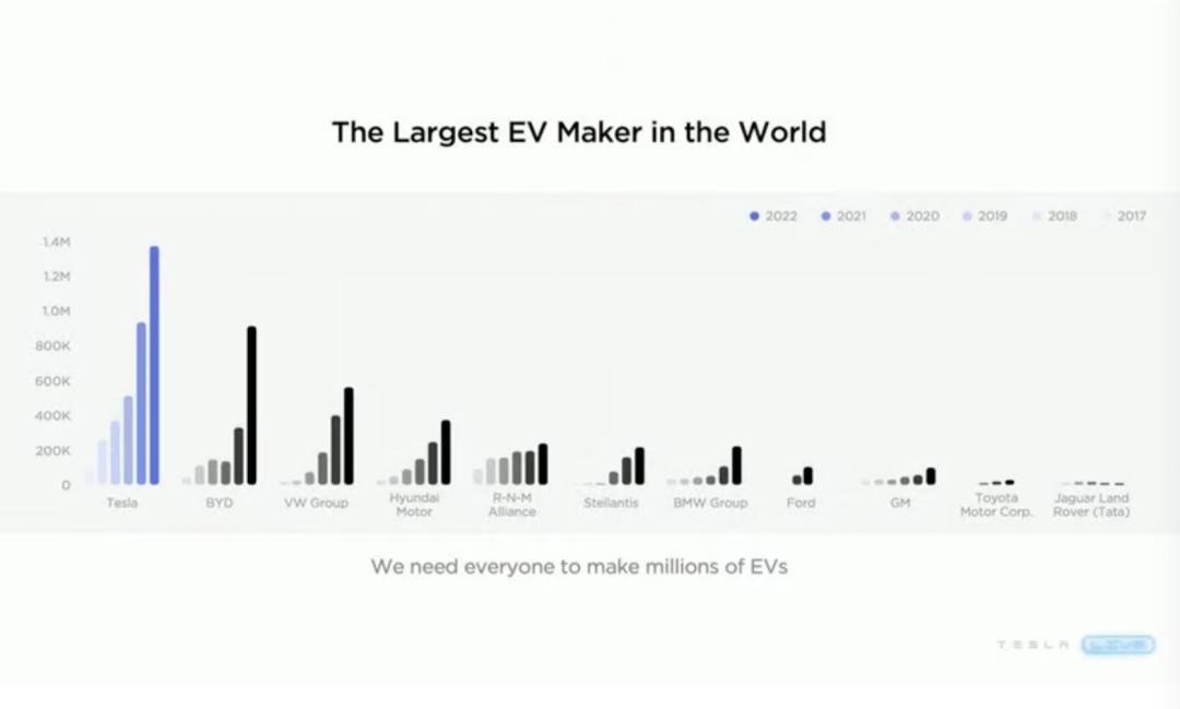 在公司体量层面,马斯克表示,特斯拉目前是世界上最大的电动汽车制造商——而比亚迪、大众、现代等车企,都依次排在特斯拉之后。