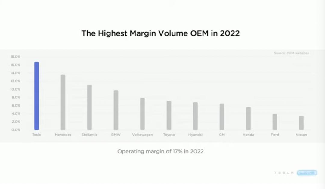 同时,马斯克也表示,2022 年,在全球的汽车制造商中,特斯拉拥有最高的运营利润率(16.8%),超过了 Mercedes、Stellantis、BMW 等一众汽车巨头。