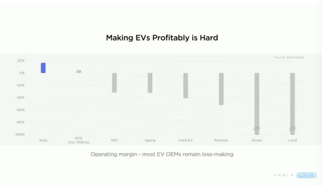 有趣的是,马斯克也在现场强调,通过制造电动汽车产生盈利是非常艰难的——他给出的一张展示图显示,除了特斯拉和比亚迪之外,蔚来、小鹏、极星等电动汽车品牌都处于亏损状态。