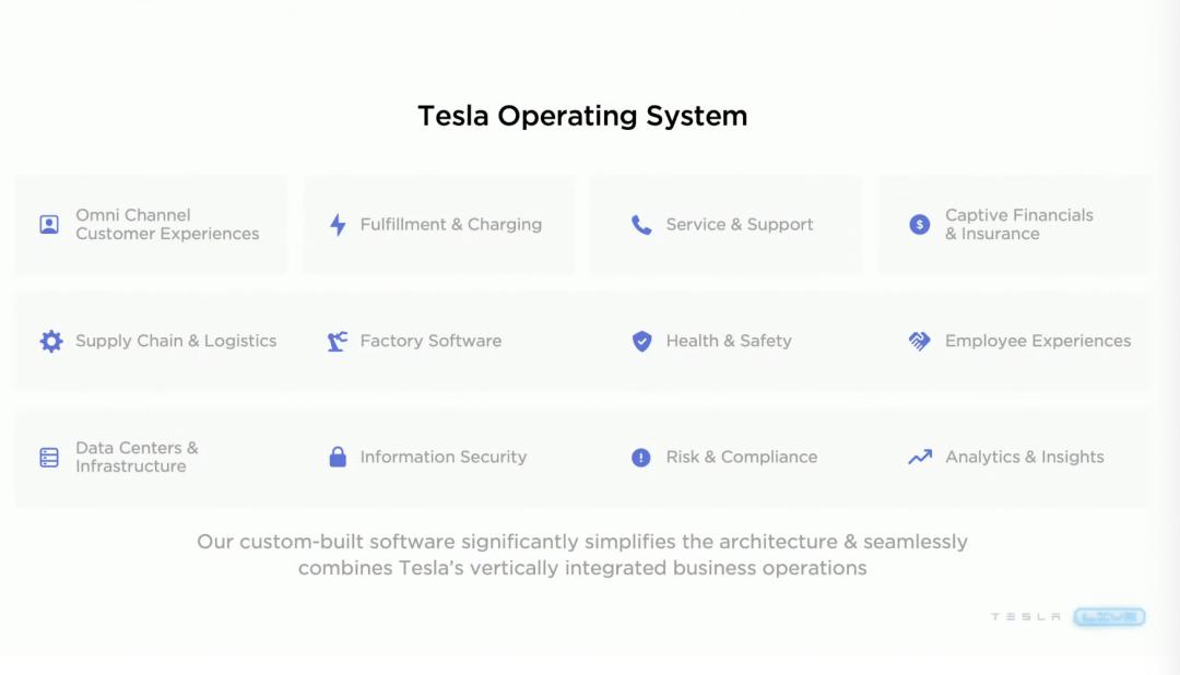 在现场,马斯克展示了特斯拉运营系统(Tesla Operating System),包括供应链&物流、健康&安全、信息安全、服务&支持、分析&洞察等 12 个板块。此处,马斯克强调,特斯拉的自研软件在运营中起到了关键作用,它们简化了架构,并与特斯拉的垂直整合商业模式无缝地融合在一起。