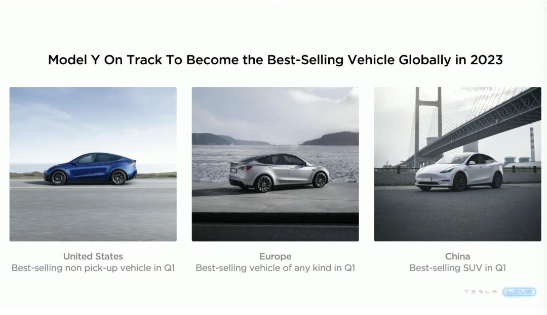 具体到产品,马斯克重点谈到了 Model Y。从第一季度的表现来看,Model Y 在美国市场成为最为畅销的非皮卡车型,在欧洲市场成为所有车型中最为畅销的一款,在中国市场成为最畅销的 SUV——基于这样的 Q1 成绩,马斯克强调,Model Y 有希望成为 2023 年全球范围内最畅销的一款车型。