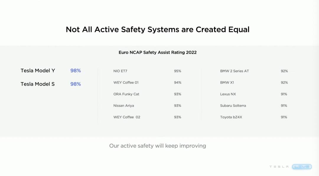 在演讲中,马斯克还专门强调了特斯拉对安全的重视。根据现场展示的图表,在主动安全层面,特斯拉 Model Y 和 Model S 在欧洲 NCAP Safety Assist Rating 2022 测试中都获得了 98% 的高分——排在它们之后的,有蔚来的 ET7(95%)和魏牌 Coffee 01(94%)。
