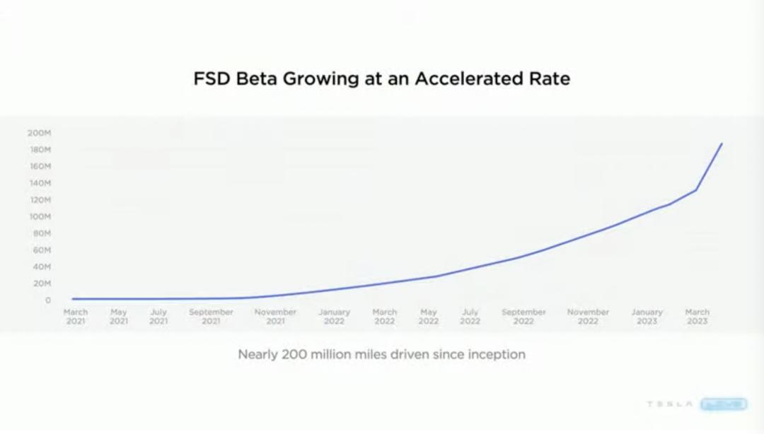 比如说,在股东会议上,马斯克在谈到 FSD Beta 时表示,使用 FSD Beta 的用户越来越多,从发布到现在,采用 FSD Beta 的行驶里程已经接近 2 亿英里,而 FSD Beta 将会特斯拉汽车带来巨大的价值提升。