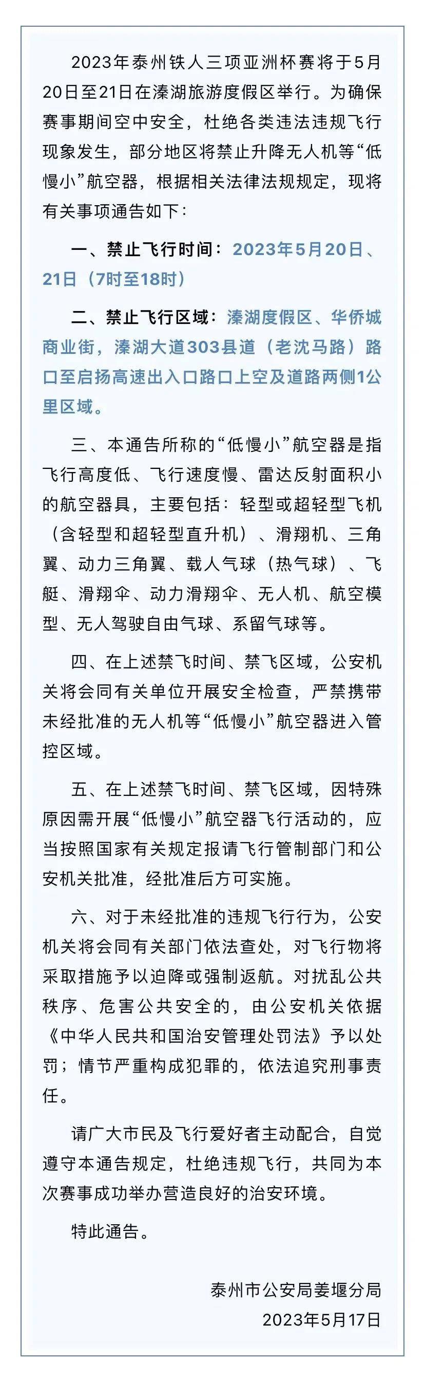 5月17日,泰州市公安局姜堰分局发布关于在2023年泰州铁人三项亚洲杯赛期间实施无人机管控的公告:5月20日、21日(7时至18时),溱湖度假区、华侨城商业街,溱湖大道303县道(老沈马路)路口至启扬高速出入口路口上空及道路两侧1公里区域禁止升降无人机等“低慢小”航空器。