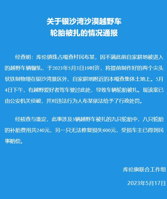 经查明:库伦镇珠占嘎查村民布某,因不满此前自家耕地被进入的越野车辆辗轧,于2023年5月3日19时许,将提前制作好的两个尖头状铁制物埋在银沙湾景区外、自家耕地附近的本嘎查集体土地上。5月4日下午,有越野爱好者驾车驶过此处,导致车辆轮胎被扎。现该案已由公安机关侦破,并对违法行为人布某依法给予了行政处罚。