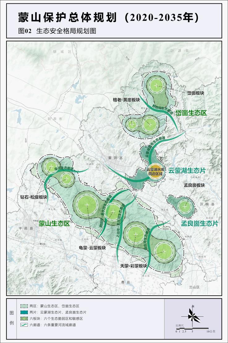 两区:指蒙山生态区和岱崮生态区。生态建设重点是山体自然形态和地貌景观的保护以及森林资源的涵养保育。