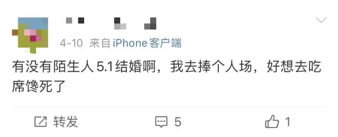 更有人在网络上呼喊:有没有陌生人结婚啊,我给你当伴娘,不用红包,能吃席就行。
